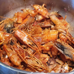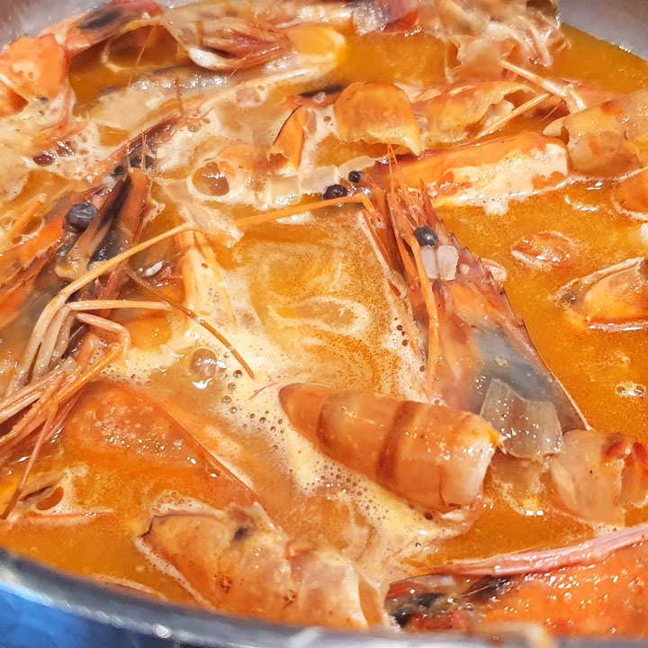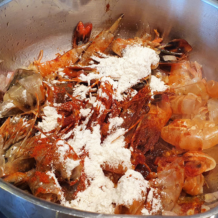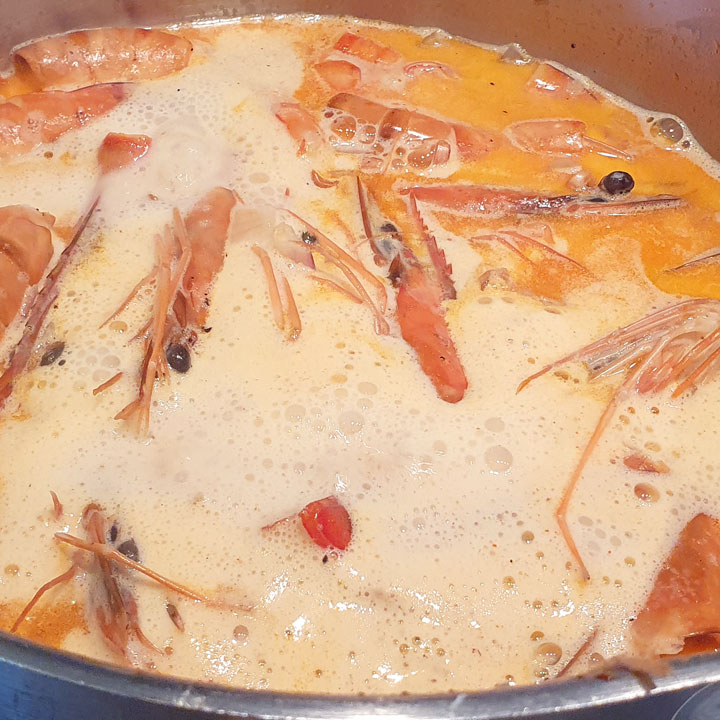 - In einem Topf 30 g Butter schmelzen und den Knoblauch und die Schalotte darin 2 Minuten andünsten. Die Garnelenkarkassen und das Mehl dazugeben und gut verrühren. Eine Minute lang anbraten. 3 dl Wasser zugeben. Pfeffern, salzen und zwei gute Prisen scharfen Paprika und die gleiche Menge süßen Paprika hinzufügen. Zum Kochen bringen und dann 2 dl Rahm dazugeben. Den Saft bei schwacher Hitze etwa 20 Minuten köcheln lassen und dann durch ein Sieb filtern. Mit einem Spatel gut auf die Karkassen drücken, um möglichst viel Saft zu gewinnen. Zurück in den Topf geben und die Zitrone hinzufügen. Abschmecken und mit Salz und Pfeffer abschmecken. Beiseite stellen.