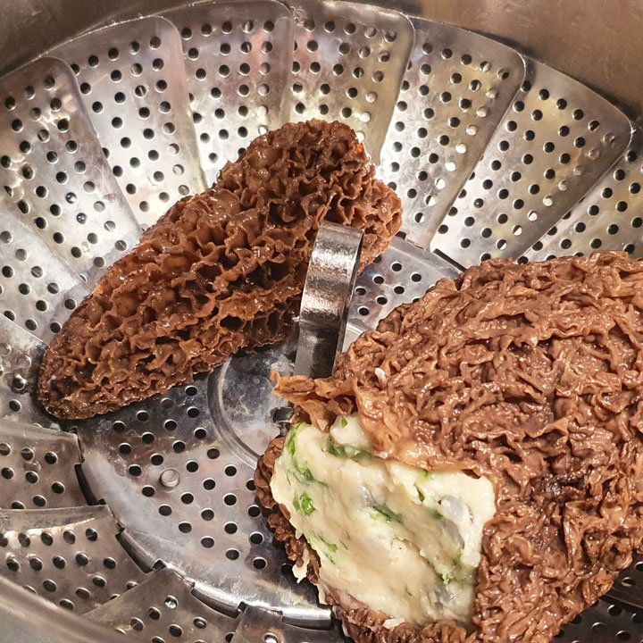 - Die gefüllten Morcheln zugedeckt 15 Minuten lang dämpfen (ab dem Siedepunkt). Zum Beispiel mithilfe eines Dampfkorbs oder eines Dampfgitters, das in einen Topf mit Wasser gestellt wird.