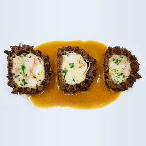 - Den Saft erwärmen. Die Morcheln auf ein Brett legen und der Breite nach einschneiden. Die gefüllten Morchelstücke hübsch auf einem Teller anrichten, etwas Garnelensaft dazugeben und mit etwas Fleur de Sel, Piment d’Espelette und geschnittenem Schnittlauch bestreuen.