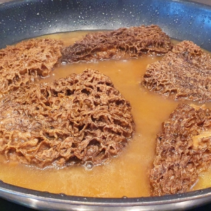 - In einer Pfanne 20 g Butter zerlassen und die Morcheln hinzufügen. Bei mittlerer Hitze auf jeder Seite 2 Minuten anbraten. Mit Salz und Pfeffer würzen und etwa 3 dl des reservierten Einweichwassers hinzufügen. Zum Kochen bringen, dann die Hitze auf kleine Flamme reduzieren und zudecken. Etwa 25 Minuten kochen lassen, dann die Morcheln aus der Pfanne nehmen und abtropfen lassen. Beiseite stellen.